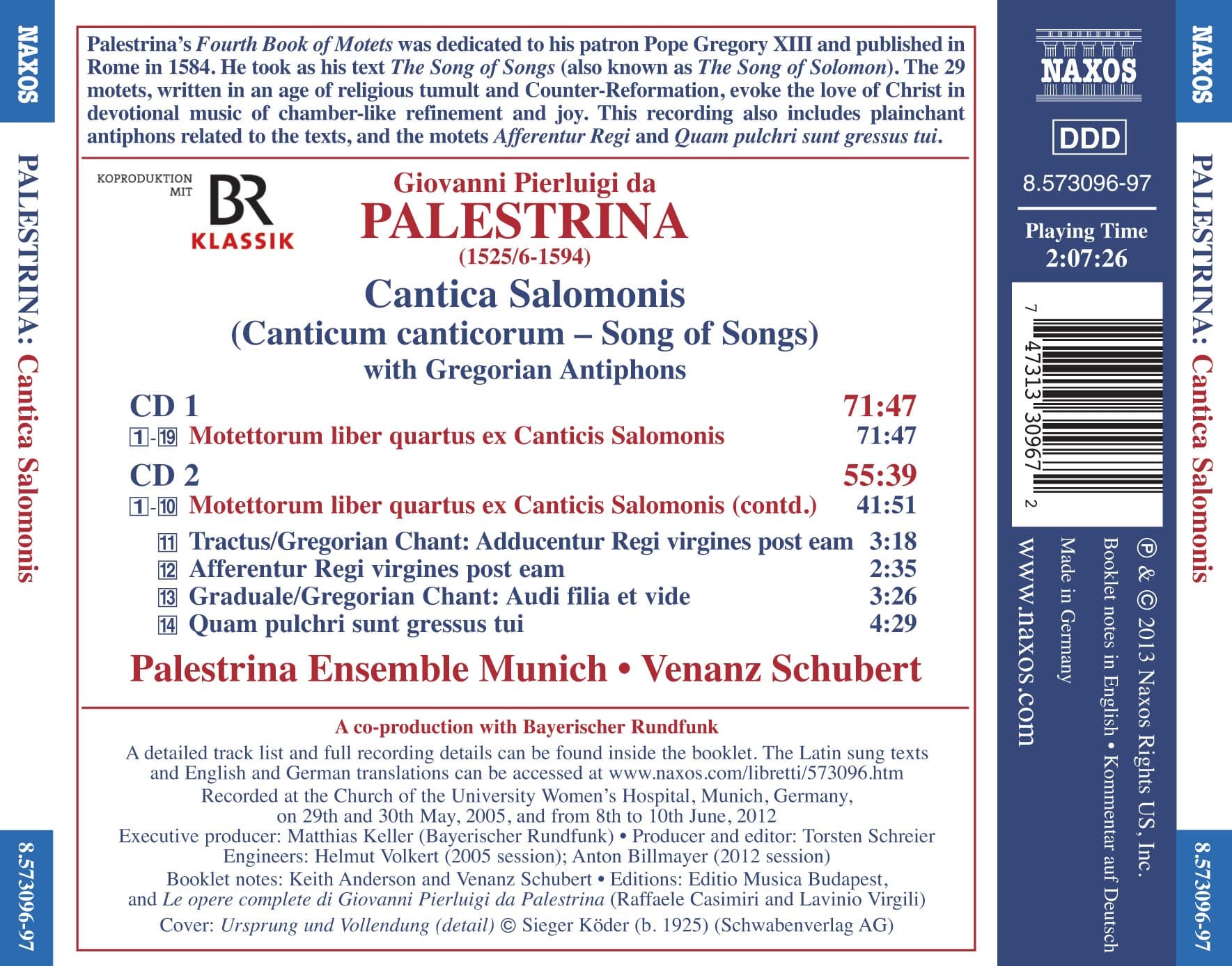Czwarta Księga Motetów Palestriny została zadedykowana jego patronowi Papieżowi Grzegorzowi XIII i opublikowana w Rzymie w 1584 roku. Jako tekst przyjął Pieśń nad pieśniami. 29 motetów, napisanych w dobie religijnego zgiełku i kontrreformacji, przywołuje miłość Chrystusa w pobożnej muzyce, kameralnej wytworności i radości. Nagranie zawiera również antyfony chorałowe związane z tekstami oraz motety Afferentur Regi i Quam pulchri sunt gressus tui.
