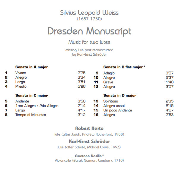Silvius Leopold Weiss był jednym z najwybitniejszych lutnistów w Niemczech na początku XVIII wieku, a dzięki swoim trasom koncertowym jego muzyka cieszyła się dużym zainteresowaniem publiczności., Choć większość jego dzieł znajduje się w Manuskrypcie Londyńskim w Bibliotece Brytyjskiej oraz w Manuskrypcie Drezdeńskim w Saksońskiej Bibliotece Państwowej w Dreźnie, część jego twórczości zaginęła. Cztery sonaty w wykonaniu Roberta Barto i Karla-Ernsta Schrödera, które zawiera płyta, pochodzą z kolekcji drezdeńskiej, choć rękopis zawierał tylko jedną partię lutni; dzięki wewnętrznej strukturze i spójności pewnych schematów, sugerujących kanoniczną imitację i sekwencje, Schröder był w stanie zrekonstruować drugą partię lutni, która była oczywiście niezbędna jako równorzędny partner. Sonaty te składają się z czterech części, na wzór Sonaty da Chiesa, a nie jako suity kilku tańców, choć muzyka jest dość żywiołowa i nosi cechy allemande, sarabandy, gawota i menueta, choć bez wyraźnego określenia. Wykonania są eleganckie i pełne energii, a oceniając je na podstawie wyważonych dialogów między dwoma muzykami, rekonstrukcje Schrödera można uznać za udane, ponieważ zadowalają zarówno pod względem technicznym, jak i ekspresyjnym, a brzmią idiomatycznie, stylistycznie adekwatnie i całkowicie przekonująco.